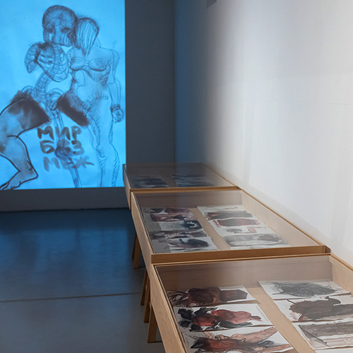 The exhibition by Vlada Ralko and Volodymyr Budnikov is a spontaneous presentation of works created during their residency in Poznań as part of a program carried out by the Wielka 19 Association. The primary context for Ralko’s and Budnikov’s art is currently the Russian aggression in Ukraine. The artists create extremely intense works, originating not only in their thoughts and feelings, but also in their existential, visceral cognition of the horror of war, the refugee experience, and work as artistic nomads.