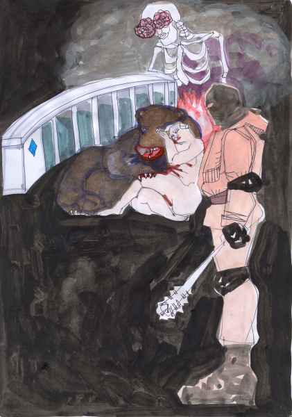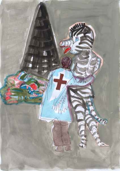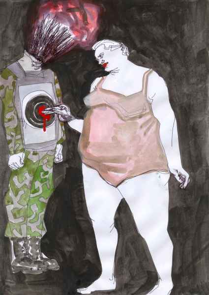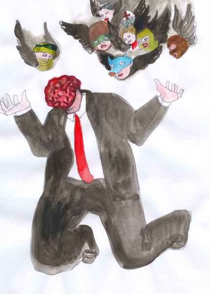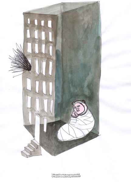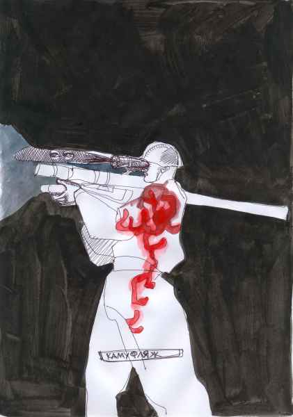 I often combined human and animal attributes on a single sheet. It was not a forced simile: I found most of the “animal” elements in the events that I witnessed myself. For example, I drew a man in a bear or animal costume several times: all these types were indeed at Maidan, not leaving it even during the most dangerous moments. Men in animal costumes or owners of live white doves (of peace?), offering to pose for a photograph for a modest fee, did not leave even after downtown Kyiv was engulfed in flames. Their presence added a surreal air of symbolism to the unfolding events.