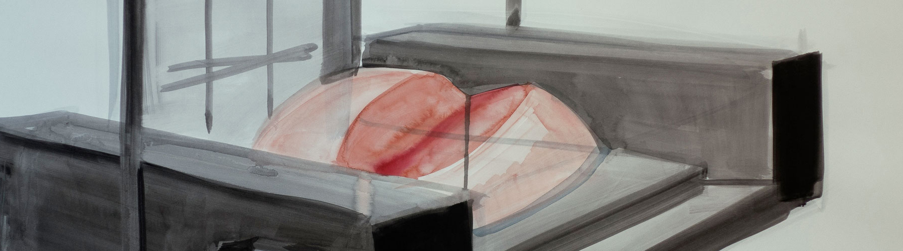 The series of watercolour works on paper depicts a number of anthropomorphic objects that are instead obscure and seem to deliberately avoid naming. The objects are placed in the exteriors of an old Soviet recreation centre, the environment of which is almost identical to a prison, school or any other Soviet space intended for public use.