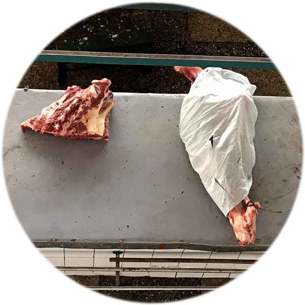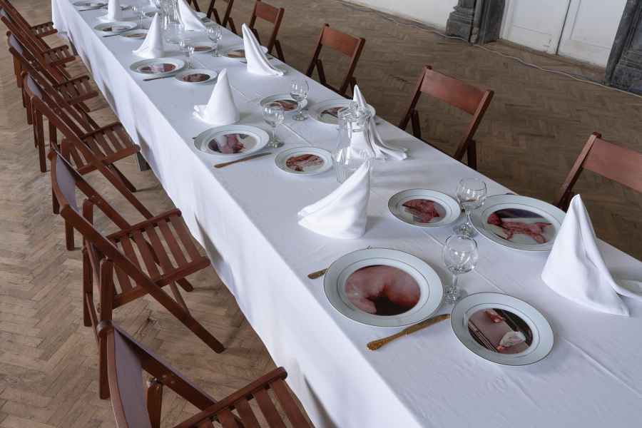 *Images on the plates: photos taken by me in the kitchen of a pathetic restaurant in Kaniv (Ukraine), in the meat department of the Rye Market in Kyiv, in the Johann Georg Pinsel Museum of Sculpture, and in the National Museum of Lviv. I also used copies of illustration fragments taken from my grandmother's cookbook "Polish Kitchen" (1957).